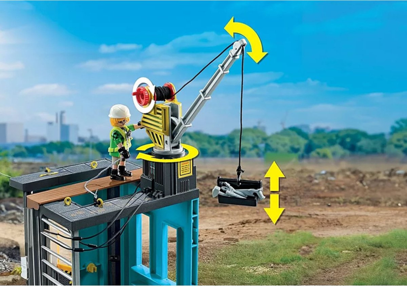 Er is altijd wel iets te doen op de bouwplaats! De stalen liggersteiger staat al op zijn plaats en nu is de elektronicus de kabel op het dak aan het leggen. Natuurlijk draagt hij een helm en handschoenen en is hij goed gezekerd met een klimgordel. Zware voorwerpen worden gemakkelijk op het dak gehesen met de lier. Met nog veel meer bouwaccessoires. De geweldige PLAYMOBIL bouwset bevat een bouwwerk met een beweegbare kraan, drie PLAYMOBIL figuren, een verdichter, een gereedschapskist en nog veel meer coole extra's voor mega rollenspelplezier.