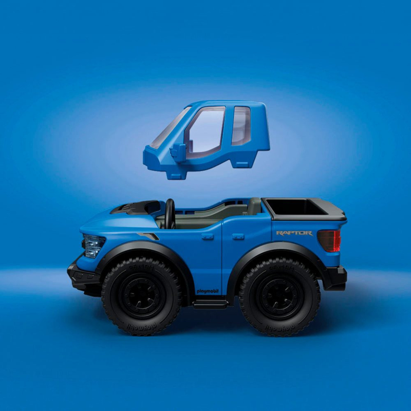 De speelset bevat een PLAYMOBIL-figuur, een mini Ford F150 Raptor met afneembaar dak, gedetailleerd interieur en vele andere leuke extra's.