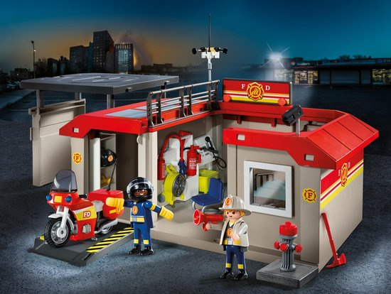 Actie voor de PLAYMOBIL brandweerploeg. Met deze praktische brandweerkazerne in de draagkoffer zijn de PLAYMOBIL-redders altijd en overal klaar voor actie. Naast een motor met garage heeft de brandweerkazerne een helikopterplatform en een carport. Het stapelbed is beschikbaar om uit te rusten tijdens de wachtdienst. Brandweermateriaal en ander materieel vindt u op de planken en aan de materieelwand.